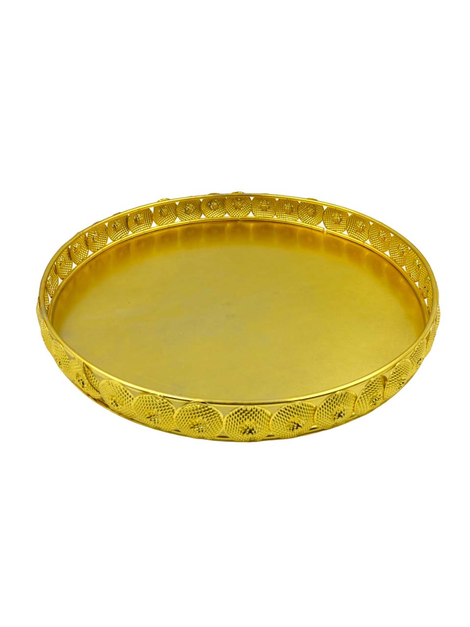 Decorative Golden Round Tray – Elegant Metal Platter with Intricate Embossed Patterns for Serving and Home Décor|COLOUR-GOLD| Brand Name : SUGARCRAFT BOX CO